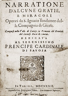 Narratione d’alcune gratie, e miracoli operati da S. Ignatio fondatore della Compagnia di Giesù comparso nella Valle di Lanzo in Piemonte del Dominio del Sereniss. Duca di Savoia (1632)